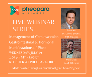Dr. Camilo Jimenez, MD Anderson The information presented on this webinar is for educational purposes only and should not substitute the advice of your doctor(s) and medical team because they have in depth knowledge of your medical history and … Continue reading Cardiovascular, Gastrointestinal & Hormonal Manifestations of Pheo Para