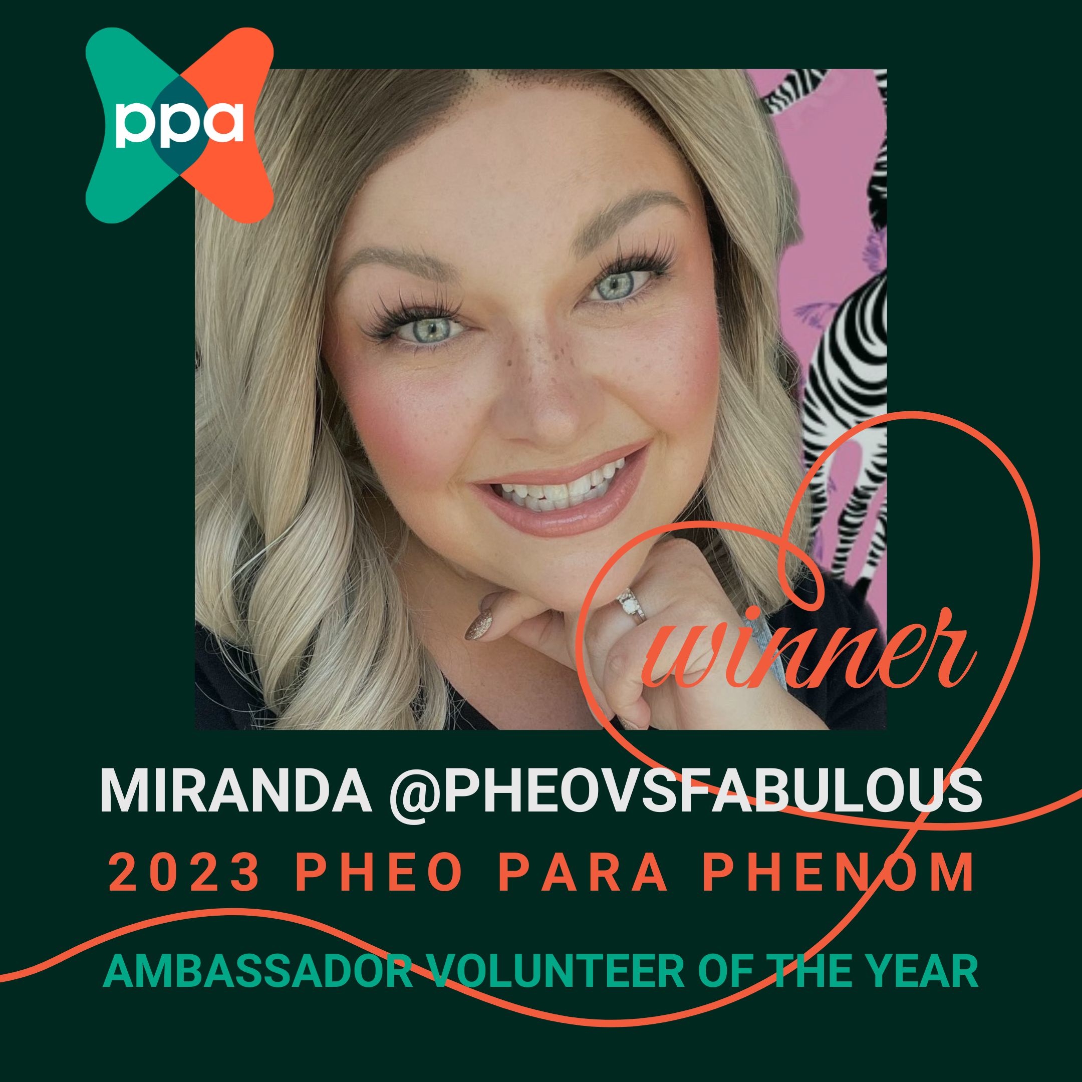 Congratulations to Miranda aka Pheo vs. Fabulous who has been awarded the Ambassador Volunteer of the Year Award. Miranda was first diagnosed at age 19 after a heart attack. A few years later she was diagnosed with metastatic disease and told she had only a year to live. 13 years later, she uses her voice to support and educate patients and raise awareness. Through her tremendous online presence as pheo vs. fabulous on Instagram, Facebook, Tiktok and her website, she has provided hope and inspiration to countless patients. The ‘always fabulous’ Miranda provides a wealth of resources, tips and tricks to navigate all aspects of the patient journey. She has hosted a number of live feeds in honor of Rare Disease Day and Pheo Para Awareness Week. She also participated in the Virtual Phitness Fundraising Challenge and had the largest team of 50+ team members. Most recently, her story was shared broadly on insider.com! She has inspired so many patients to thrive despite the circumstances. Please help me in congratulating Miranda aka Pheo vs. Fabulous for winning the Ambassador of the Year Award. Congrats Miranda!