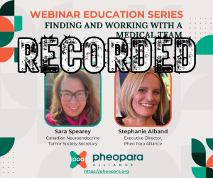 Choosing your healthcare team is one of the most consequential choices you’ll make in the management of your pheo para diagnosis. Pheo Para Alliance Executive Director Stephanie Alband and Canadian Neuroendocrine Tumor Society Secretary Sara Spearey offer … Continue reading Watch the Recording for Education Webinar Series – Finding and Working With a Medical Team